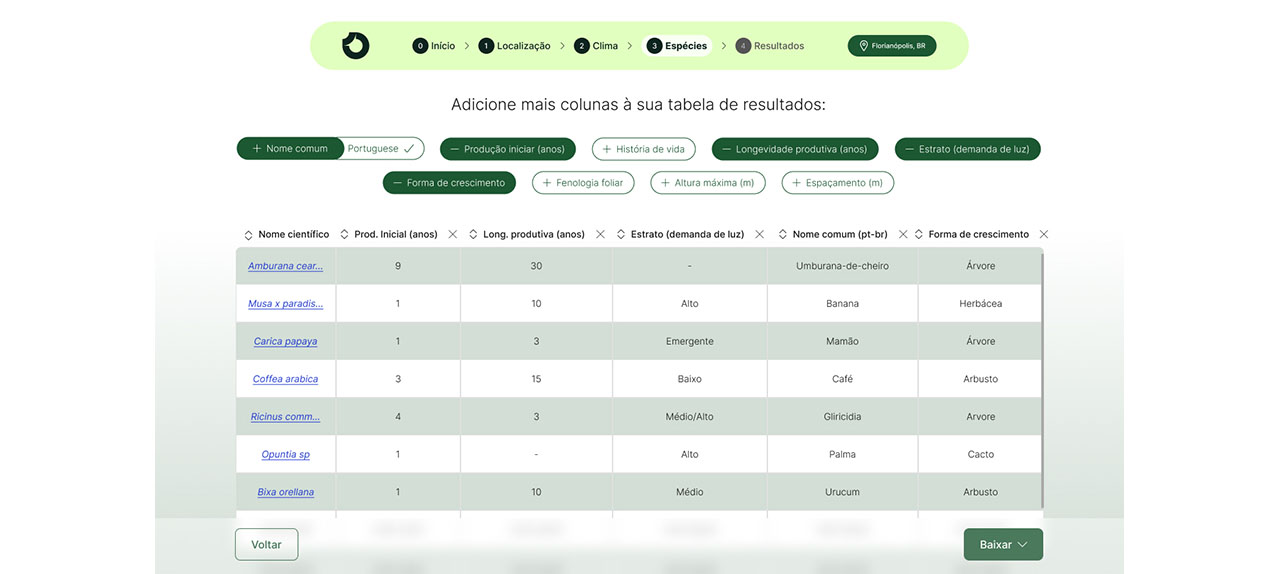 Selecione as espécies ideais para o seu projeto com base em critérios como uso, ameaça de conservação e ciclo de vida. Nosso gráfico de demanda de luz e período de colheita te ajuda a criar um sistema agroflorestal eficiente e produtivo.