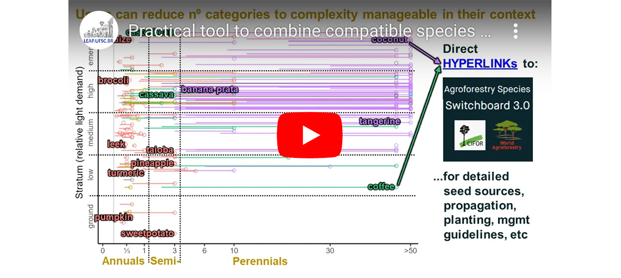Para ampliar a aplicabilidade em contextos ambientais e socioeconômicos, as regras de montagem de consórcio minimizam a sobreposição de nichos ecológicos fundamentais com base em características de plantas obtidas para milhares de espécies. Para preencher lacunas de dados em dimensões de nicho importantes (por exemplo, tolerância à sombra) e garantir praticidade agronômica e silvicultural, integramos fontes de características científicas com a experiência de praticantes de agrofloresta por meio do compartilhamento de conhecimento científico cidadão.